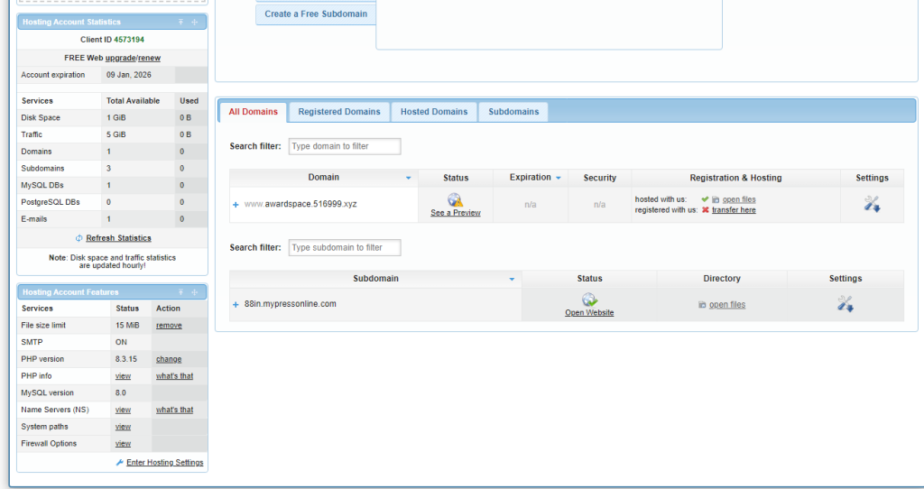 AwardSpace是德国的一家主机运营商,创始于2003年,服务器数据中心位于保加利亚首都索菲亚。AwardSpace免费虚拟主机有1GB容量,5GB/月流量,单个文件限15MB以内,总文件数量不超过25000个,可绑定1个自己的域名,最多免费添加3个二级域名,总计可建4个网站,支持CGI(Perl)、PHP(可切换版本),可创建1个MySQL数据库(限30MB容量),一键安装WordPress在内的几十种程序,FTP、Web方式上传管理文件。AwardSpace还提供1个以你域名为后缀的企业邮箱,支持POP3、SMTP、IMAP,但仅有50MB容量,且单个附件不超过2MB。