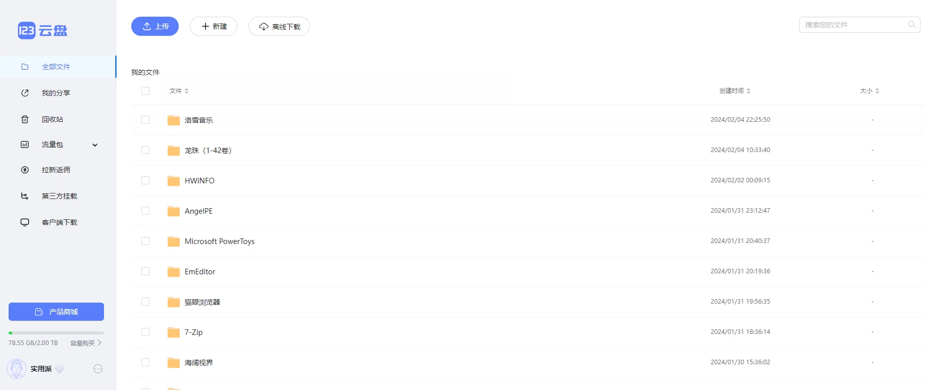 - 大容量免费空间:注册即送 2TB 永久免费空间,满足海量文件存储需求,支持 MD5 秒传,提升重复文件上传效率。