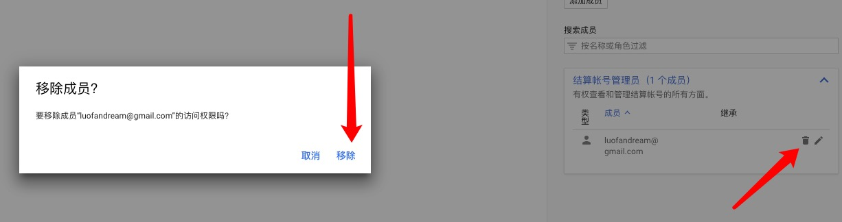 1.进入你的Google Cloud控制中心 https://console.cloud.google.com/ ,然后进入到 “结算” -> “我的结算账号” ,然后看下右边的,在里面添加一个成员。