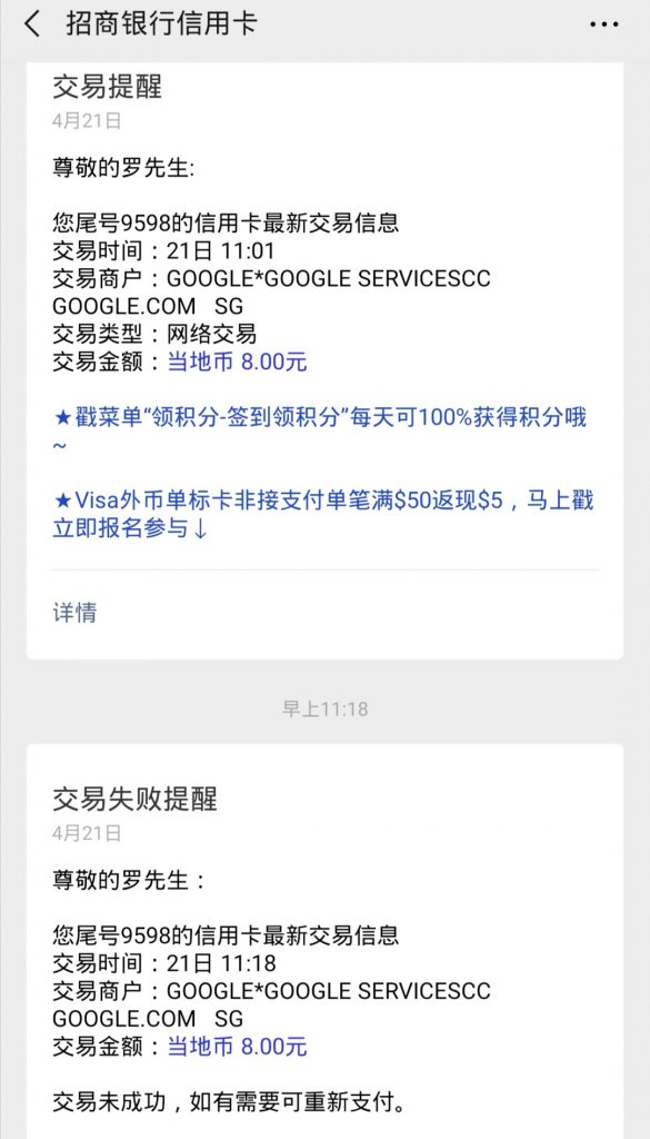 扣款后就可以看到Google的到账提醒了,如下图所示: