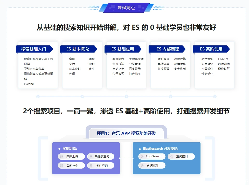 作为主流的全文检索中间件,Elasticsearch 已经是目前后端必须扩展的技术之一。但很多同学在学习时缺乏系统学习的资料。本课程聚焦 Elasticsearch,基于新发布的 ES8 版本讲解,从基础运用到原理剖析,到综合实战,带你系统性掌握 Elasticsearch 的知识技能,遇到问题不发愁。