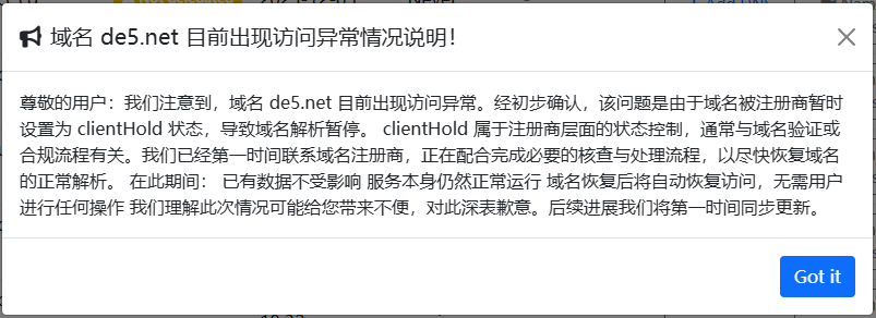 尊敬的用户:我们注意到,域名 de5.net 目前出现访问异常。经初步确认,该问题是由于域名被注册商暂时设置为 clientHold 状态,导致域名解析暂停。 clientHold 属于注册商层面的状态控制,通常与域名验证或合规流程有关。我们已经第一时间联系域名注册商,正在配合完成必要的核查与处理流程,以尽快恢复域名的正常解析。 在此期间: 已有数据不受影响 服务本身仍然正常运行 域名恢复后将自动恢复访问,无需用户进行任何操作 我们理解此次情况可能给您带来不便,对此深表歉意。后续进展我们将第一时间同步更新。