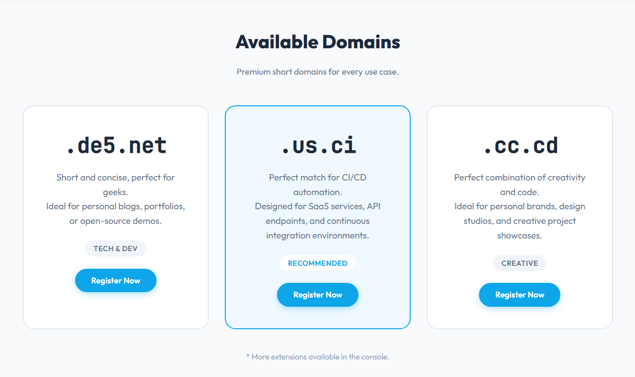 域名后缀.de5.net/.us.ci/.cc.cd,其中.de5.net支持添加CloudFlare绑定管理。