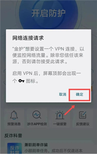 只要开启了基础权限(60分),金护就能在安装后一定的时间内预警(1天左右)。但是由于金护APP的使用方式比较特殊,需要长期在手机里存活才能实时的守护大家的网络安全,所以还是希望大家能按照指引正确安装,让金护能长期在手机里存活,时刻守护大家的钱袋子。