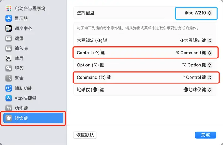 - 交换 Control 与 Command 键功能在修饰键设置界面中,找到 Control 键 和 Command 键 的下拉选项: