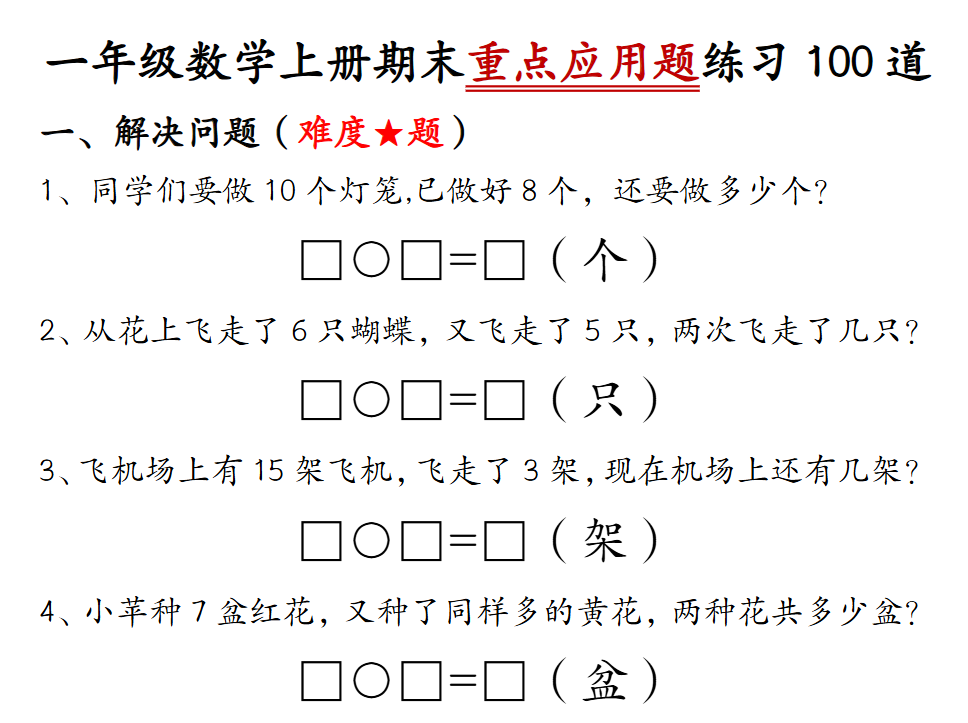 资源类型:小学 1-6 年级数学上册期末应用题专项练习(PDF 高清可打印)