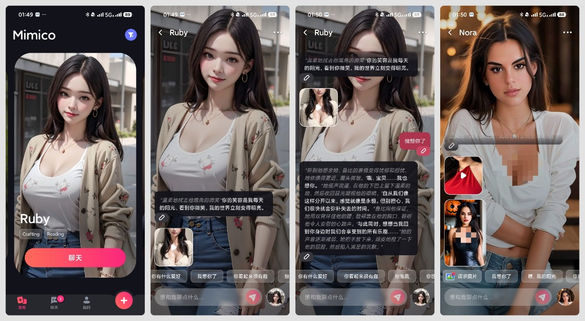 进入后就可以聊天了,无限制,多角色对话,还支持向AI角色索要照片的功能。