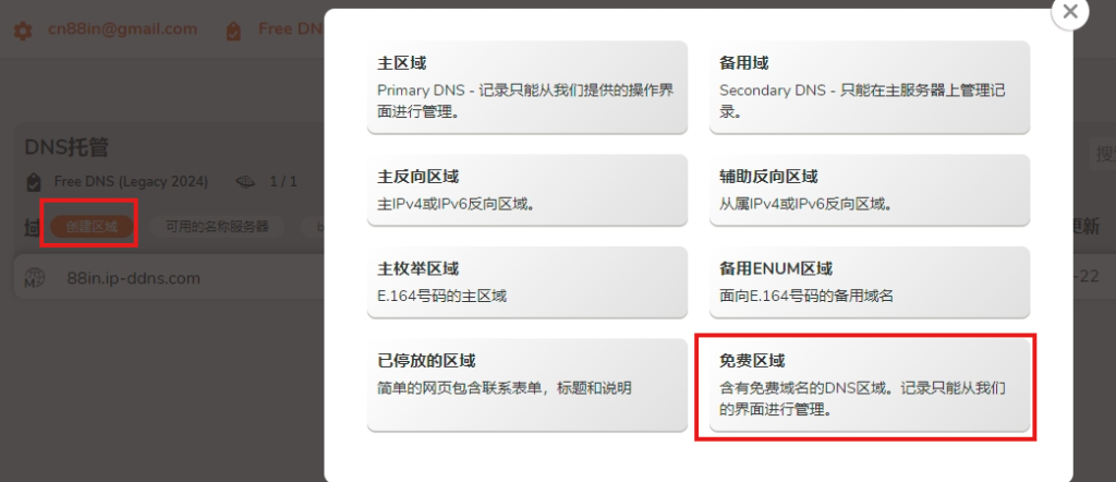 在创建免费域名的界面,选择一个您喜欢的后缀,如 .ip-ddns.com,并自定义您的域名前缀,例如:88in.ip-ddns.com。