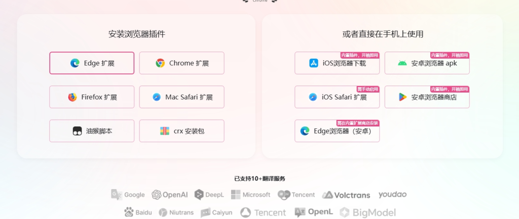 沉浸式翻译是一个完全免费的聚合型翻译插件,它聚合了Google翻译、OpenAI、DeepL、火山翻译、微软翻译、腾讯翻译君、有道翻译、百度翻译、小牛翻译、彩云小译、腾讯交互翻译、阿里翻译、Azure翻译、OpenL等十余种在线翻译服务,你可以任意选择用哪家的翻译服务来实时翻译外语网页、PDF文档、ePub电子书、国外视频网站字幕、字幕文件、TXT文件等,还支持鼠标悬停翻译、输入框翻译。沉浸式翻译插件可用于Chrome、Firefox、Safari、Edge浏览器,还提供了油猴脚本、ZIP安装包,无论电脑还是手机上都能使用沉浸式翻译!
